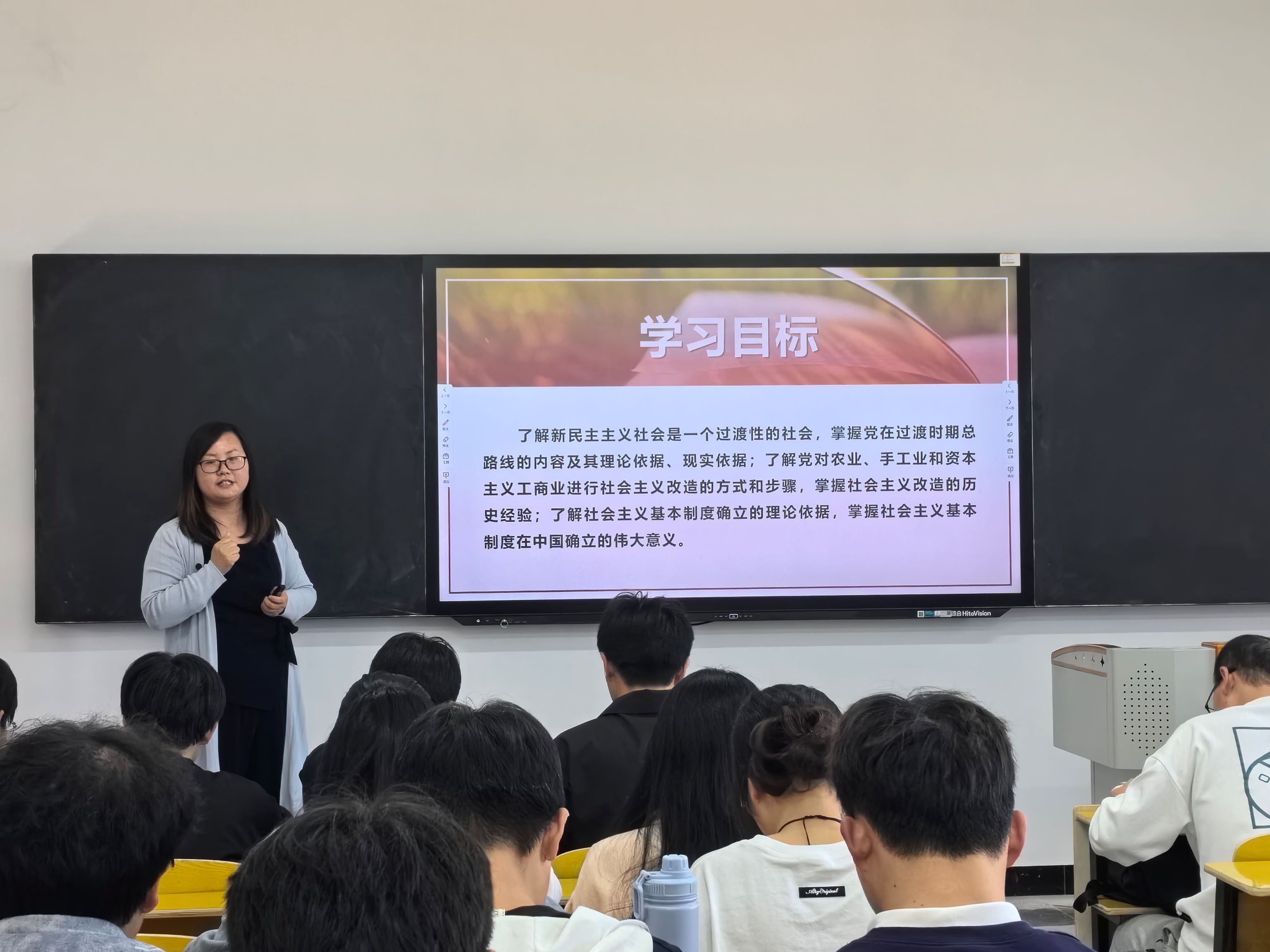 课上,黄艳博士围绕《社会主义改造理论》展开讲授。黄艳博士以《护士日记》中主题曲《小燕子》为导入,强调不同年代的文艺作品,能够客观反映当时的社会历史条件,引起了同学们浓厚的学习兴趣。通过深入分析我国新民民主社会期间的经济结构,带领同学们学习新民主主义社会为什么是一个过渡性的社会,使大家很直观的理解决定社会性质的根本原因以及为何要进行社会主义改造,生动体现了毛泽东坚持把马克思列宁主义的基本原理同中国实际相结合,着眼解决中国革命和建设的实际问题,作出符合中国实际的正确回答, 得出符合客观规律的正确认识。