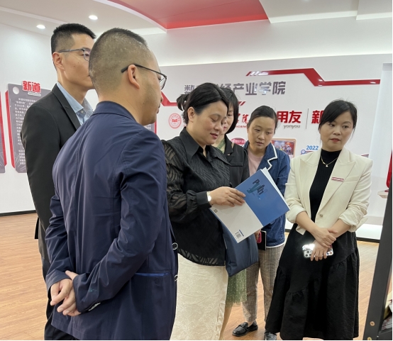 漆圆方向胡梨花一行介绍了用友新道数字财经产业学院的建设情况,并带领他们参观了实践教学基地。