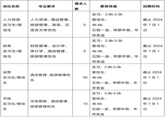 1、大专及以上学历,2024届应届毕业生,2023届优秀毕业生亦可,各届实习生,专业不限,旅游管理、酒店管理及相关管理专业优先;2、有班干部、学生会、社团有任职者优先;3、有一定的沟通能力、管理能力,团队意识强、执行力强者优先;4、思维清晰,做事严谨仔细,具有一定的抗压能力,吃苦耐劳。