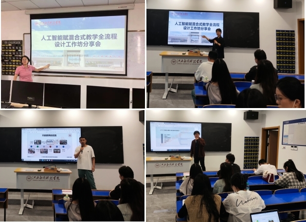 学院温郭英、杨昆昆、邓靓华、李诗婷四位老师给全体参会人员分别分享了“人工智能赋能混合式教学全流程设计工作坊”的主要内容,其中涉及的内容包括人工智能大模型在混合式教学中的实践探索、如何更好地利用人工智能技术提升教学效果的思考和讨论、混合式教学的创新路径等。随后,他们通过实例演示,展示了人工智能在课程设计、教学资源整合、学生互动评价等方面的应用,为师生们提供了丰富的参考案例。