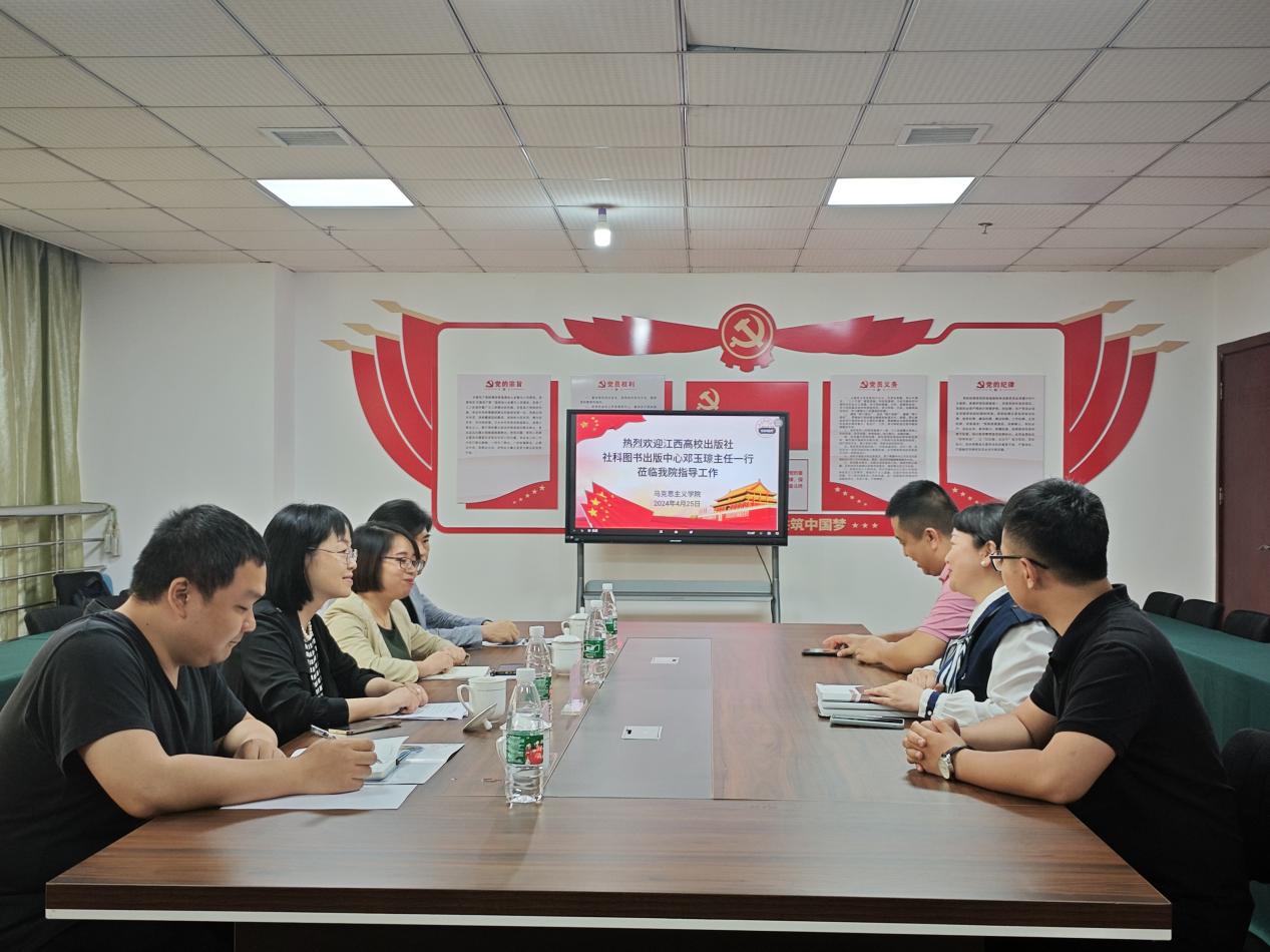 4月25日,江西高校出版社社科图书出版中心邓玉琼主任带队,江西高校出版社社科图书出版分社副主任、副编审曾文英、主任助理姚平、编辑熊天赐莅临我院对马克思主义学院下一步如何结合工作实际做好成果出版工作,更好推动我院建设内涵式发展进行指导。会议由马克思主义学院院长于冰雁主持。