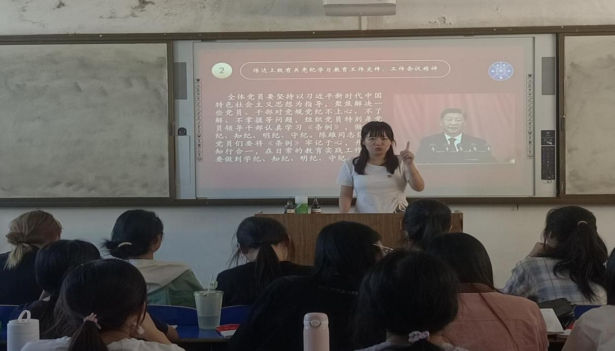 党总支专职组织员吴梦晶同志带领全体党员学习上级有关党纪学习教育工作文件、工作会议精神。她说全体成员要坚持以习近平新时代中国特色社会主义思想为指导,认真学习《条例》,做到学纪、知纪、明纪、守纪。