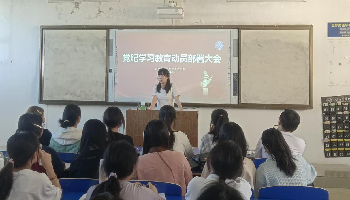 为贯彻落实习近平总书记关于党纪学习教育的重要讲话和重要指示精神,扎实推动党纪学习教育走深走实,2024年5月13日,国际商务学院学生党支部在三达楼306教室开展党纪学习教育动员部署大会,聚焦新修订的《中国共产党纪律处分条例》(以下简称《条例》)进行宣贯解读,教育引导支部全体成员准确理解和把握《条例》主旨要义,推动铁的纪律转化为日常习惯和自觉遵循。