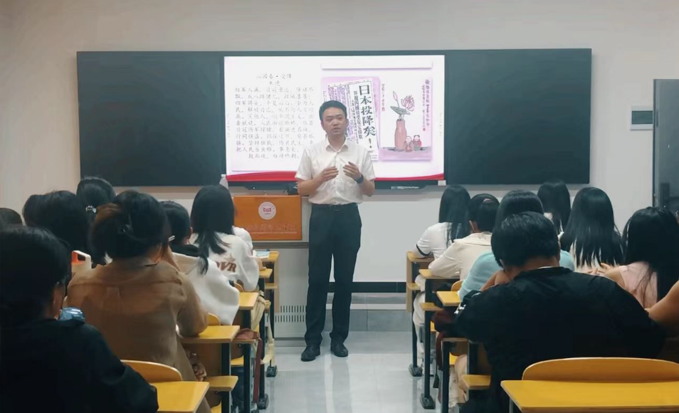 杨家翔老师以《中国近现代史纲要》第九专题内容为课程教学内容,以朱德的《沁园春·受降》作为课程导入,带领学生深入分析这首诗词背后的历史情境,进而导入课程。在教学过程中,杨老师以“大国的自我超越”为教学暗线,以抗日战争后国共双方的政策措施为教学明线,以伟大领袖毛泽东、朱德等领导人的诗词串联课堂教学,通过大量史料详细讲述了这一段历史的发展脉络,课堂氛围浓厚,学生反响强烈,能够贯彻唯物史观进行历史解释。