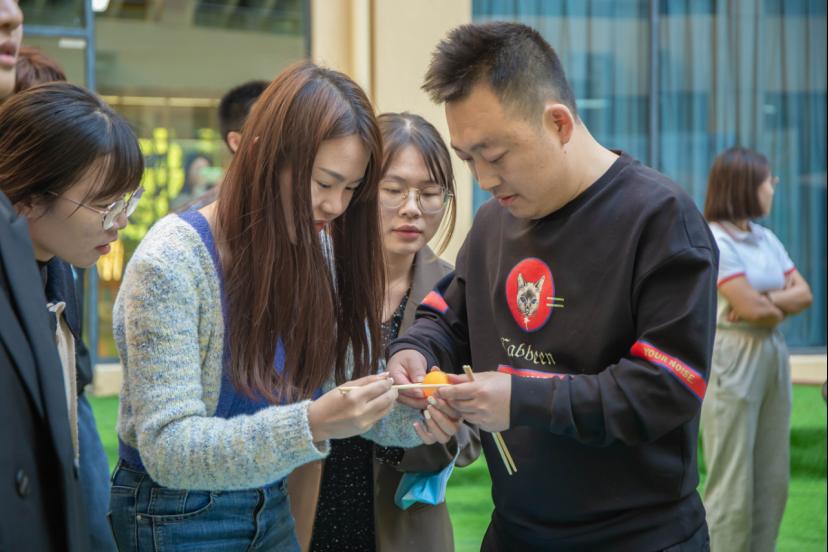 有限时间里需要用筷子运送尽可能多的乒乓球入筐,考验青年的技术活了。男女教师们也在相互配合的默契中逐渐化解尴尬与陌生的气氛,互动环节很好的表现出了他们内心的真实想法。