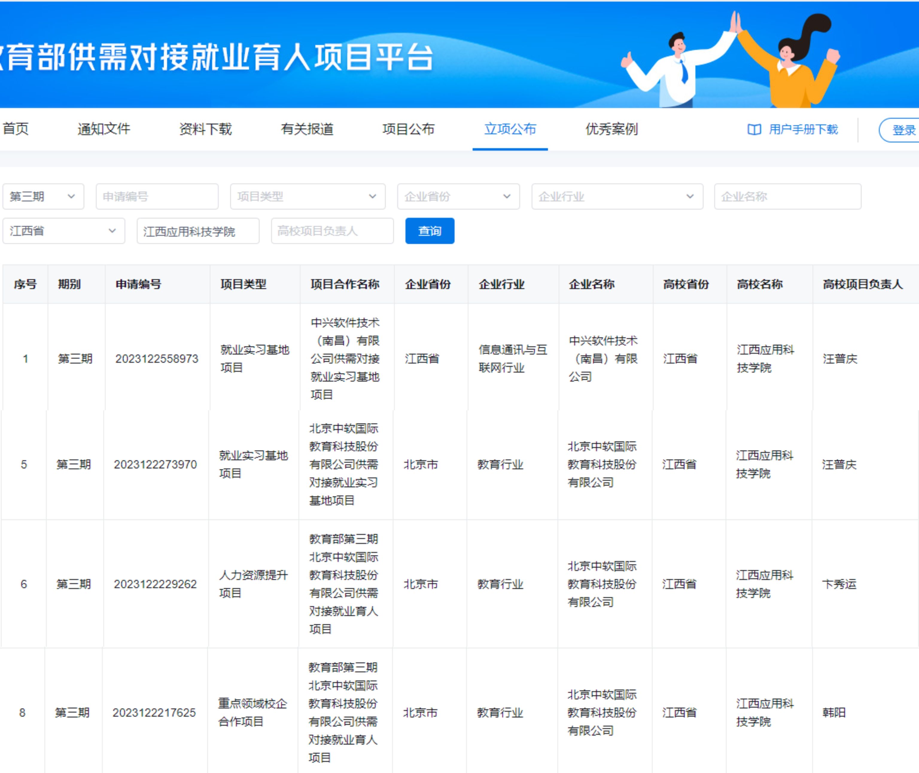 教育部高校学生司组织用人单位和高校实施供需对接就业育人项目,是进一步落实党中央、国务院“稳就业”“保就业”的决策部署,是深化产教融合、校企合作,推动人才培养与就业的有机联动、人才供需有效对接的有效途径。自申报工作启动以来,学院积极响应号召,认真进行申报论证,与校企合作对接单位深入研讨、紧密合作。经用人单位评审、教育部高校学生司复核,我院汪普庆教授的中兴软件技术(南昌)有限公司供需对接就业实习基地项目、北京中软国际教育科技股份有限公司供需对接就业实习基地项目、卞秀运院长的教育部第三期北京中软国际教育科技股份有限公司供需对接就业育人项目、韩阳副院长的教育部第三期北京中软国际教育科技股份有限公司供需对接就业育人项目顺利立项。