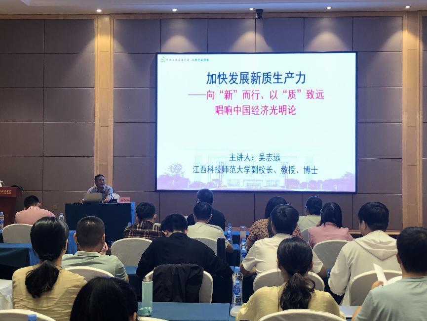 为提升思政课教师的教学水平和理论素养,深入贯彻落实习近平总书记关于新质生产力发展的重要论述。7月4日,马克思主义学院邀请金融学博士、省委党校学术委员会委员、经济学科带头人、江西科技师范大学党委委员、副校长吴志远教授作为主讲嘉宾,作了题为“加快发展新质生产力——向‘新’而行、以‘质’致远唱响中国经济光明论”的学术讲座。