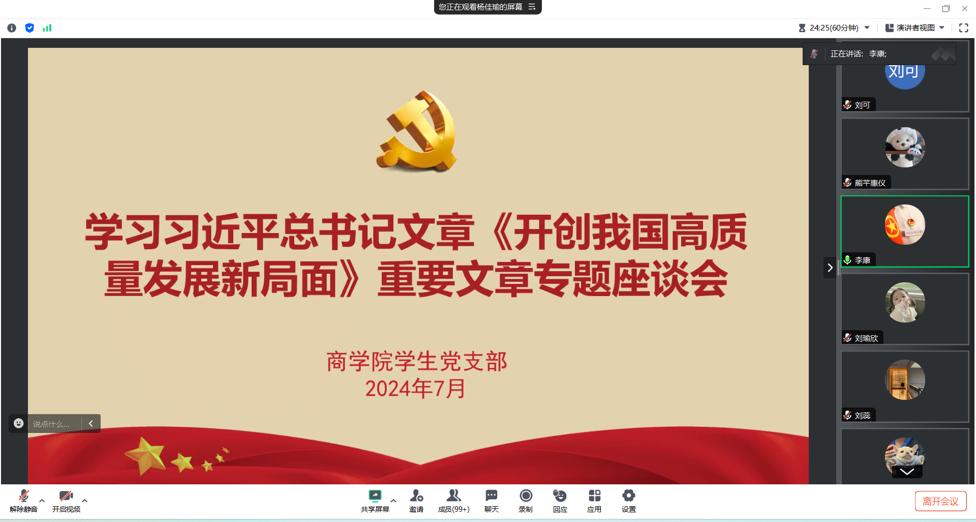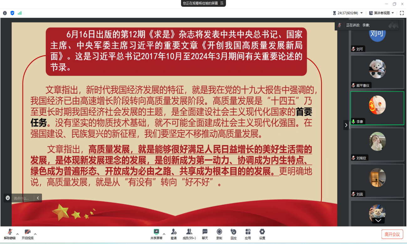 为深入学习贯彻习近平新时代中国特色社会主义思想,深刻领会高质量发展是“十四五”乃至更长时期我国经济社会发展的主题,是全面建设社会主义现代化国家的首要任务。商学院学生党支部召集各期积极分子、发展对象、预备党员和党员于2024年7月12日19时在腾讯会议开展本次学习《求是》杂志发表习近平总书记重要文章《开创我国高质量发展新局面》专题学习会。