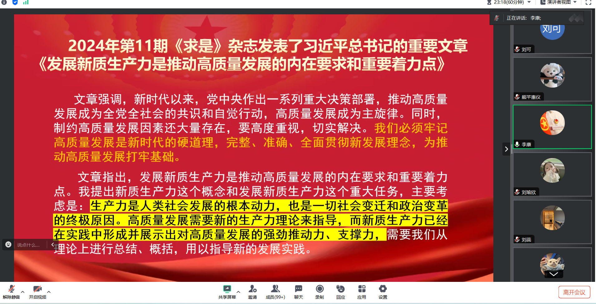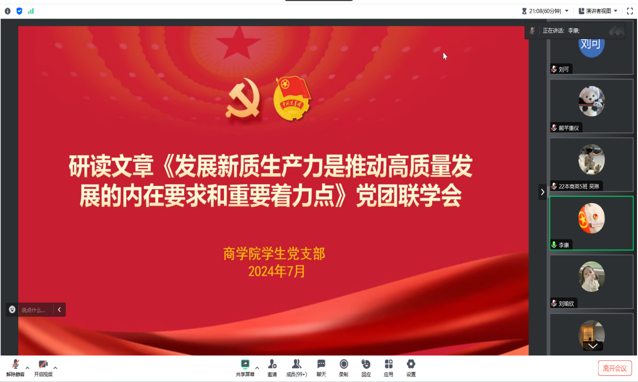 为深入学习习近平总书记关于发展新质生产力的重要论述,引导支部成员树立创新意识、推动社会实践发展,商学院学生党支部于2024年7月12日19时在腾讯会议召集各期积极分子、发展对象、预备党员和党员开展此次学习发展新质生产力是推动高质量发展的内在要求和重要着力点党团联学会。本次理论学习会的形式为学生党支部书记领学,党员代表发言。