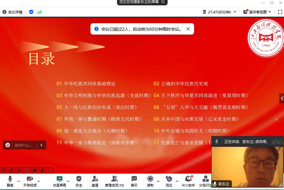接下来由彭东立老师就中华民族共同体概论一做备课教学展示,彭东立老师就中华民族共同体的发展的时间脉络和理论脉络专题进行梳理。他以说课的形式对教学的主要内容及重难点进行了简要讲述,对教学方法做了介绍。重点围绕教学过程阐述如何运用时间脉络结合民族融合缕清理论发展脉络,采用大事件文物图片和视频导入课程,以时间为脉络讲述从史前时期到民国初年的民族融合与发展的整个过程。