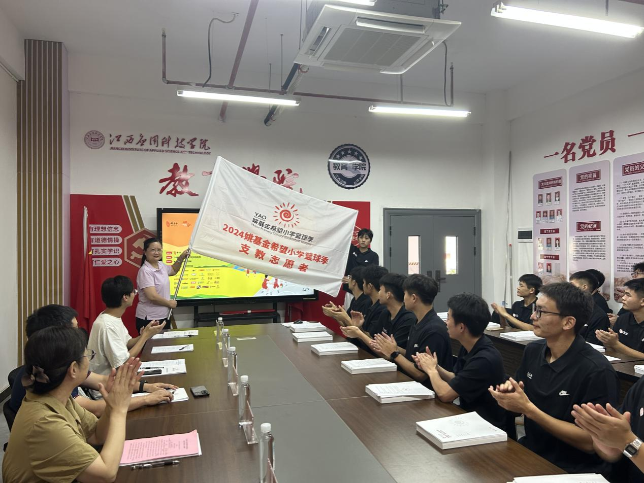 在出征仪式上,江西省“姚基金希望小学篮球季”项目负责人刘新为志愿者进行了授旗仪式,传递弘扬支教服务精神。志愿者们进行了庄严的宣誓,承诺将严格遵守纪律,认真履行职责,以饱满的热情和专业的态度投入到支教工作中去。志愿者代表谢坤同学表达了对“姚基金”和支教工作的认识,他愿通过自己的努力,做一个有责任心的教师,教授他们篮球技巧,让学生在体育锻炼中享受乐趣、增强体质、健全人格、锤炼意志。