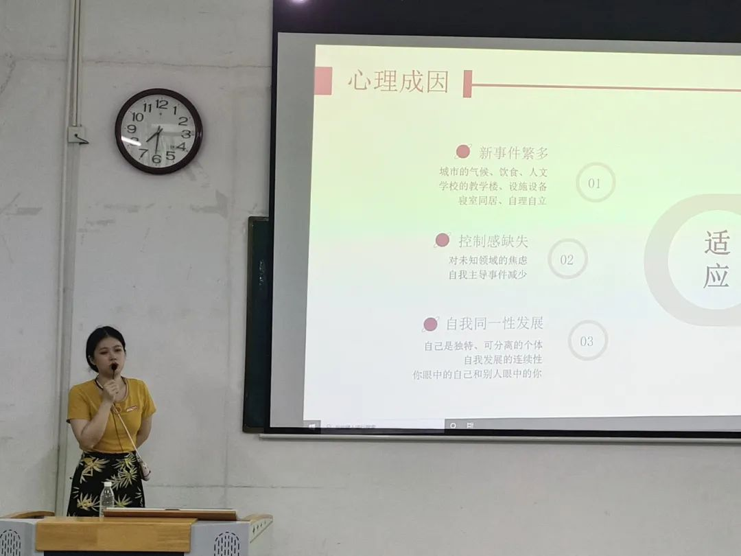 活动伊始,李雨珂老师以一个问题导入,同时以丰富的专业知识和生动的案例,从大学生活、心理成因、适应不良、改善策略这四个方面为同学们展开了一场别开生面的心灵之旅。