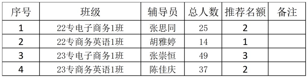 商学院国家励志奖学金本科名额共计60个,专科名额共计8个,现根据我院在校生人数和名额按照比例进行计算(本科比例约等于0.04008,专科比例约等于0.064),我院决定按各班级人数按照比例分配,具体如下: