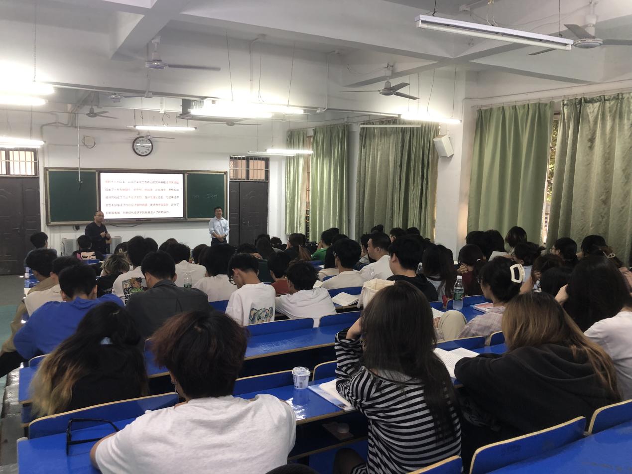 课堂上,揭志锋副院长围绕“理论逻辑”、“历史逻辑”“实践逻辑”三个维度,为同学们讲解了应该如何把握习近平经济思想的丰富内涵,并结合生活中的具体实际,为同学们如何具体把握新发展阶段、贯彻新发展理念、构建新发展格局、理解我国经济转向高质量发展的丰富内涵提供了新的思路。江志斌老师通过案例分享,抛出“何为“三去一降一补”、结合实际生活谈谈同学们对高质量发展的认识”等问题,激发同学们的自主性,引导他们主动思考。课堂上,同学们踊跃发言,积极参与其中,课堂气氛热烈。