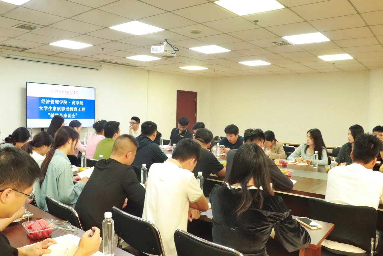 为了进一步推进大学生素质养成教育工作,促进学院间的工作交流,互相学习经验,经济管理学院和商学院联合开展大学生素质养成教育工程辅导员交流会。本次会议于2024年10月18日上午10时在综合楼305党员活动室召开,经济管理学院学工科科长苏秋月,商学院学工科科长程佳明以及两个学院全体辅导员老师出席本次会议。本次会议由经济管理学院汤淇茗主持。