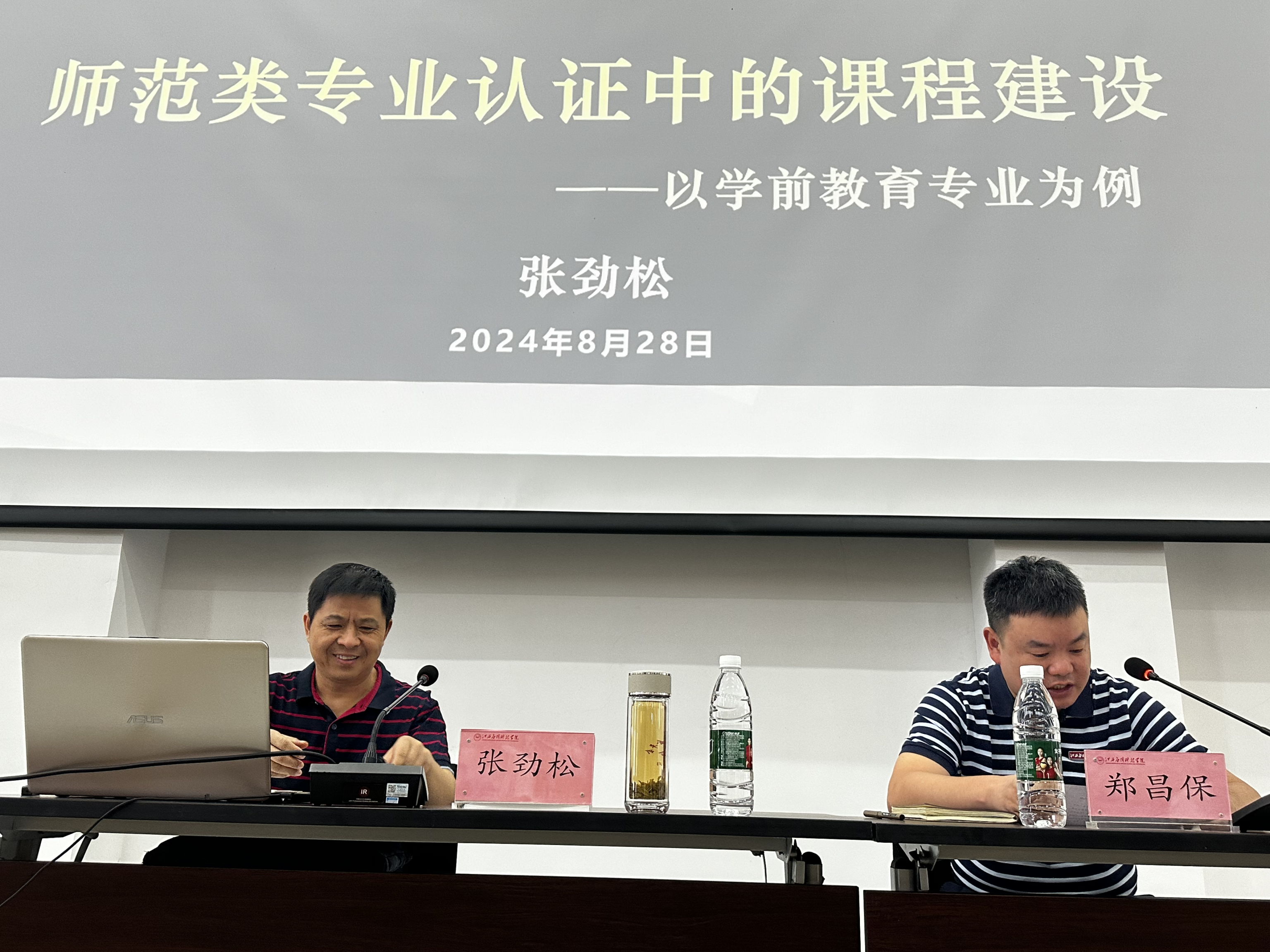 为有效推进学院师范类专业认证建设,切实提高师范类专业人才培养质量,2024年8月28日学院邀请南昌师范学院教育学院院长张劲松教授为学院开展题为《师范专业认证中的课程建设-以学前教育专业为例》的师范类专业认证专题辅导讲座。学院全体行政人员、教师等一同聆听讲座。讲座由学院院长郑昌保主持。