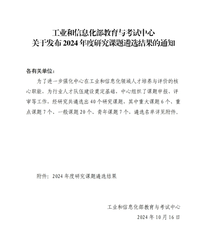 工信部教育与考试中心2024年度研究课题围绕加强和改进工业和信息化技术技能人才队伍建设,聚焦服务国家战略、服务工信领域经济主战场、服务骨干龙头企业、服务社会民生。自课题申报通知发布以来,我院积极参与申报,在学校的支持和学院的努力下,一项课题成功入选“一般课题”类别。