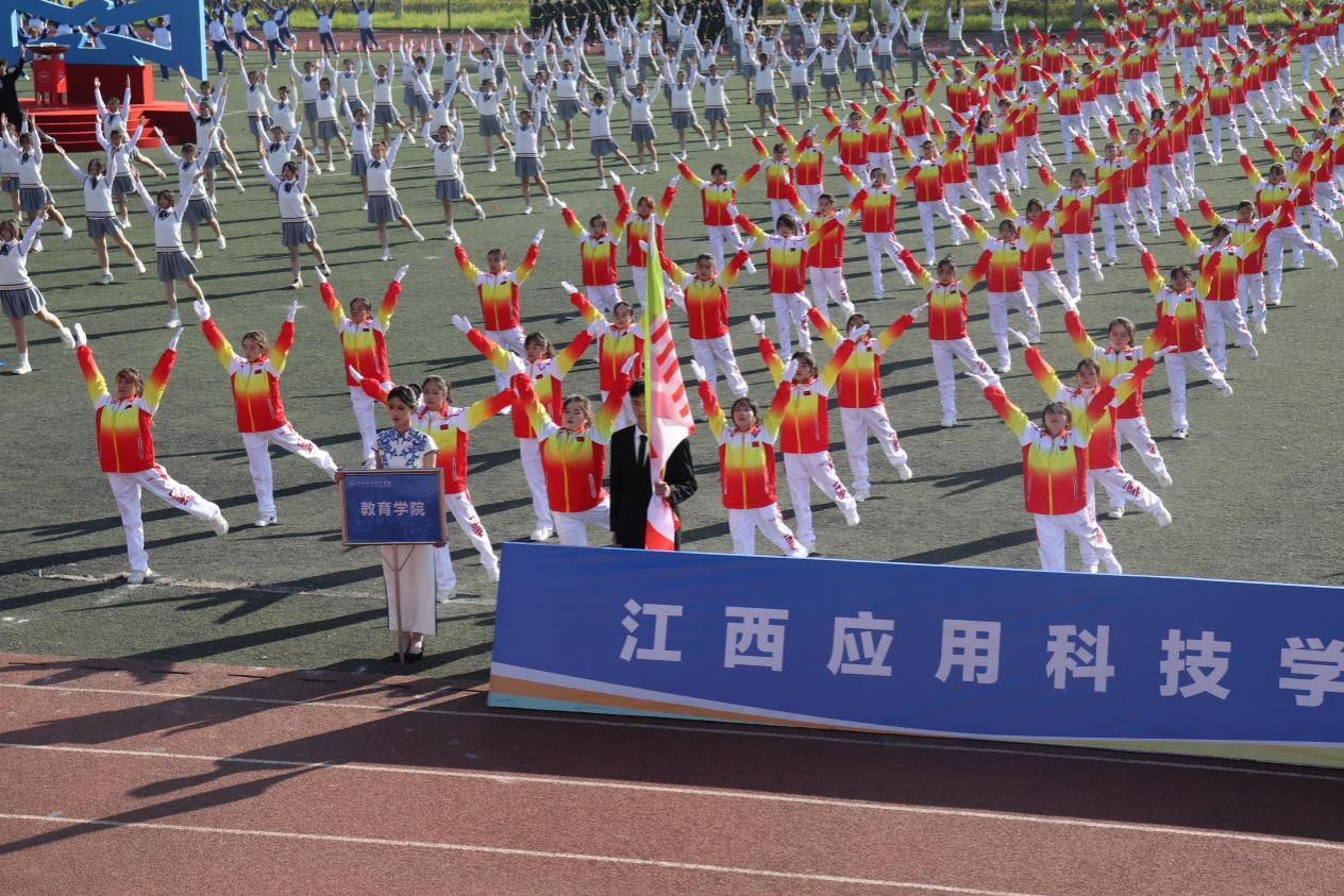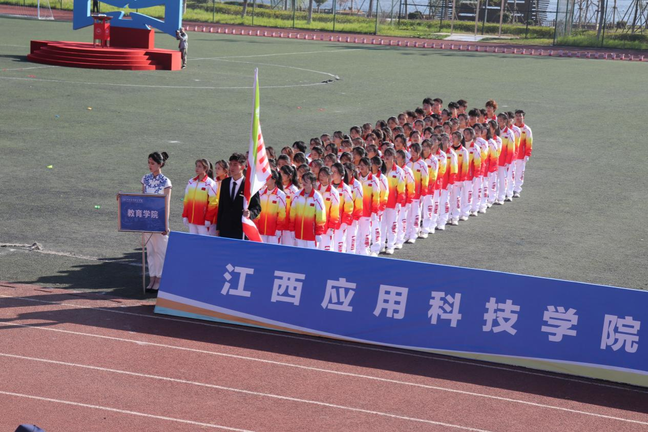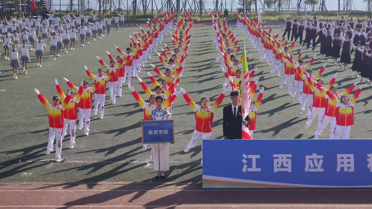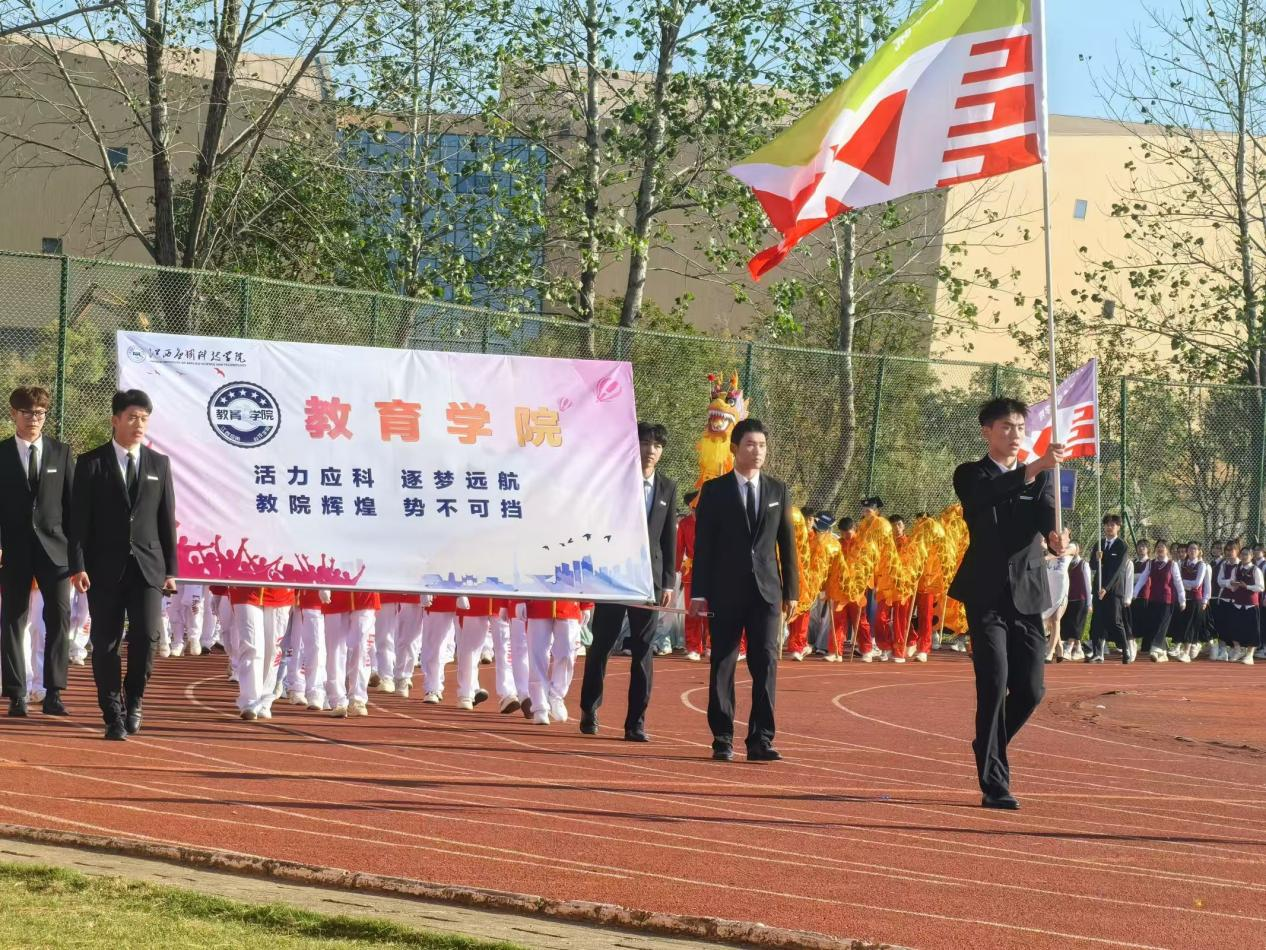 乐曲高奏,彩旗飞扬。伴随着乐曲响起,充满着书香气息与青春活力的教育学院方阵迎面走来。教院学子们昂首挺胸,激情澎湃,以崭新的面貌迎接运动会的到来。