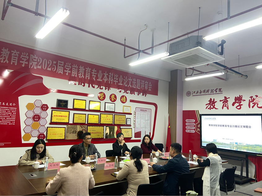 为进一步提升学院2025届本科毕业论文(设计)质量,11月1日,学院学前教育教研室在志远楼102会议室召开毕业论文(设计)选题评审论证会,江西科技师范大学教育学院学前教育系主任刘雁伶教授、南昌师范学院教育学院副院长陈美荣教授以及学院院长郑昌保、副院长刘晓领、学前教育教研室主任卓筱芸、副主任周文睿,学前教育专业教师林文教授、刘书吟讲师参加本次评审会。