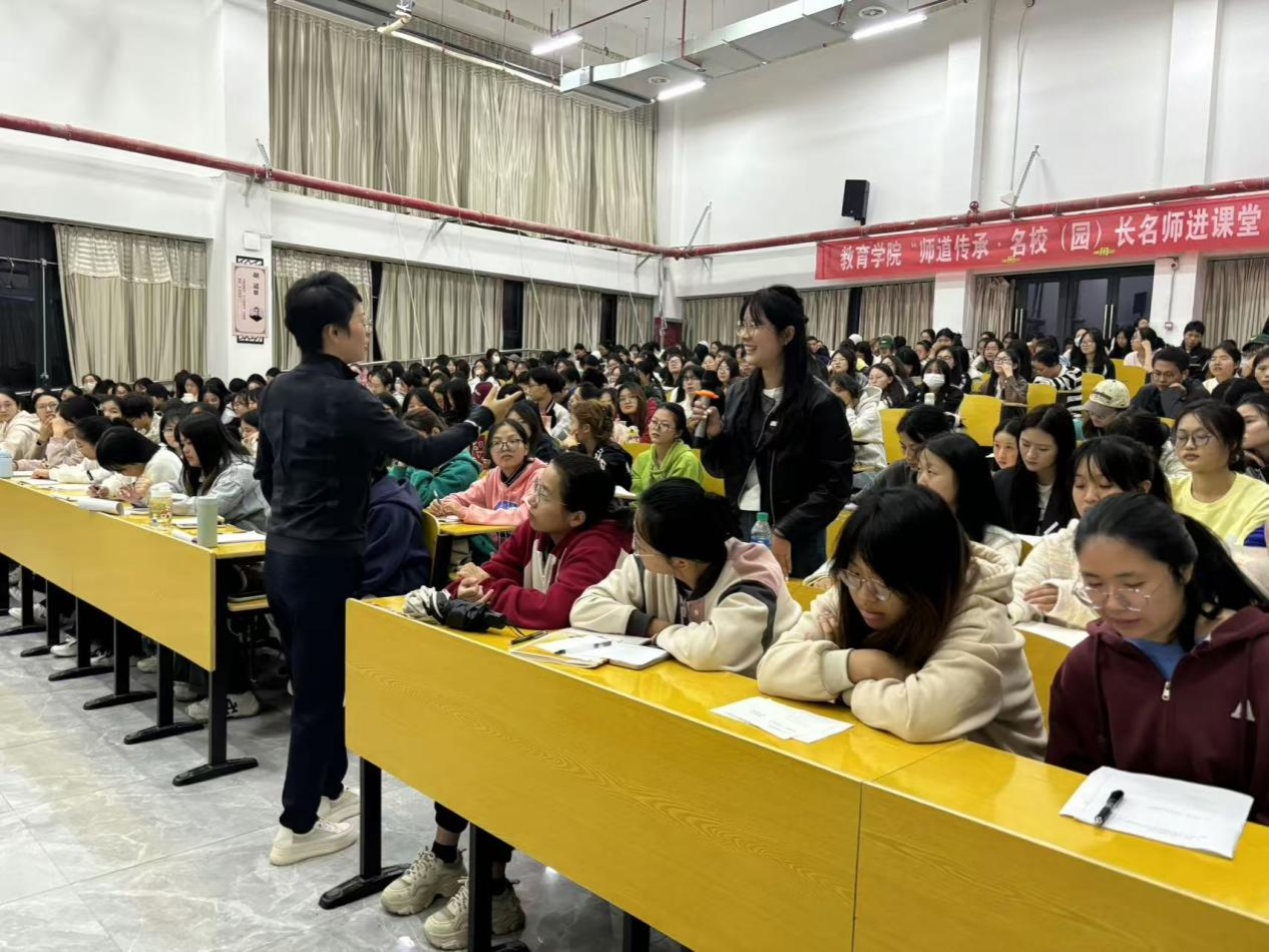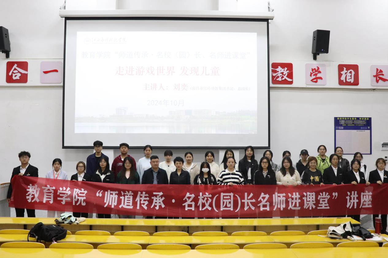 为进一步加强学院与区域基础教育的交流与沟通,加强师范生专业技能及职业素养,发挥区域基础教育领域名校(园)长、名师及其团队的教学引领与指导作用,强化学院师生对区域基础教育师资需求和课堂教学改革的清醒认识,加深学生对区域基础教育教师专业知识、专业技能和教育情怀的认识和理解,提升学生的责任意识和专业使命感,学院特举办第十八期“师道传承•名校(园)长名师进课堂”活动。10月27日,学院邀请到南昌市红谷滩红岭幼教集团书记、总园长,江西省学科带头人,省教育督导评估专家、省第一批学前教育质量提升计划指导专家、市学科带头人、洪城学师、市优秀校园长刘奕园长在志远楼101报告厅为2022级、2023级学前教育专业学生作了题为《走进游戏世界 发现儿童》专题讲座。
