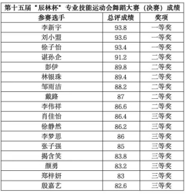决赛评委由舞蹈教研室各专任教师担任,涵盖了教学、创作和表演等多个方面,进一步保证了比赛的公平、公正与权威性。在评分标准方面,评委们不仅注重选手的技术水平和表演张力,还看重其在舞台上的表现力和创新能力。在层层选拔和严格评比下,最终评选出一等奖3名、二等奖6名、三等奖8名,表彰了表现优异的选手。评委会对所有参赛节目进行了公正的评分,按成绩排名,决赛成绩公示如下: