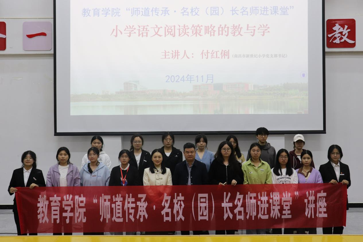 为进一步加强学院与区域基础教育的交流与沟通,加强师范生专业技能及职业素养,发挥区域基础教育领域名校(园)长、名师及其团队的教学引领与指导作用,强化学院师生对区域基础教育师资需求和课堂教学改革的清醒认识,加深学生对区域基础教育教师专业知识、专业技能和教育情怀的认识和理解,提升学生的责任意识和专业使命感,学院特举办第十九期“师道传承•名校(园)长名师进课堂”活动。11月10日,学院邀请到南昌市新世纪小学党支部书记、中小学高级教师,江西省名师培养对象、江西省骨干教师、江西省新时代“百姓学习之星”、南昌市小学语文学科带头人付红俐老师在志远楼101报告厅为2022级、2023级小学教育专业学生作了题为《小学语文阅读策略的教与学》专题讲座,讲座围绕小学语文阅读策略学习的重要性、概念内涵及实践路径展开,通过翔实的分析与案例展示,揭示了如何以系统化的方法提升小学生的阅读能力。