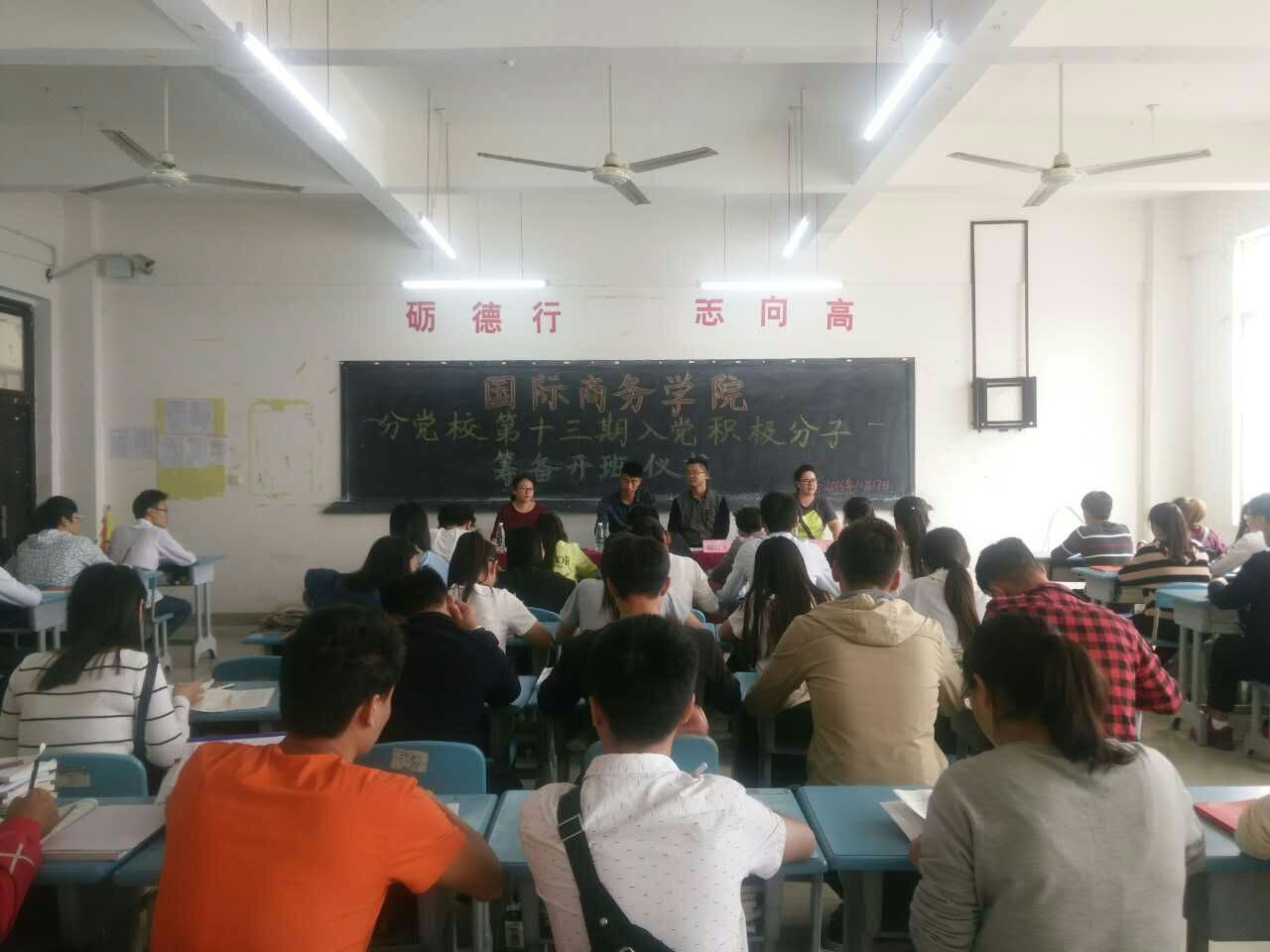 2016年10月17日中午12点,国际商务学院分党校第十三期入党积极分子培训班在三达楼410教室举行筹备开班仪式。国际商务学院党总支书记、分党校校长戴红永,学校党委综合办公室、组织部副科长张梁,国际商务学院党总支委员、学生党支部书记张荆参加会议。会议由国际商务学院党总支组织委员、分党校办公室主任李洁主持。