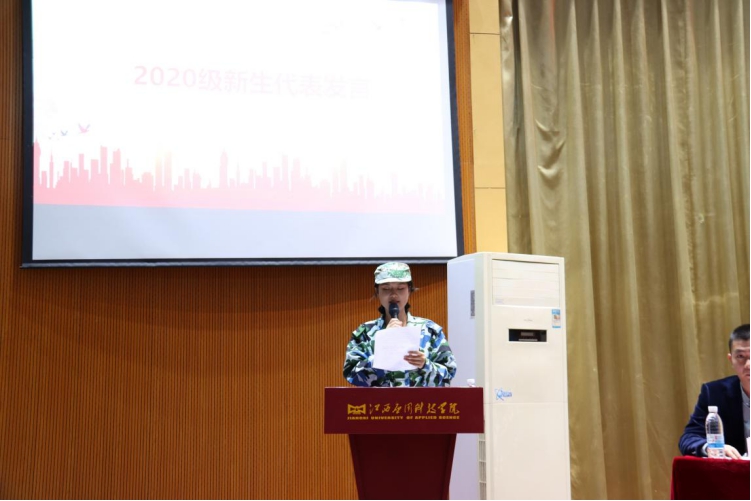 2020级新生王寒亭代表发言,她从不同角度表达了自己对大学生活的期许,明确好自己今后学习的目标,规划好自己的学习道路,她说道大学不仅仅是要学习专业知识更是学习做人、学习独立生活的地方,更是一个能够挖掘自身优点、实现才华的平台,并鼓励同学们努力学习专业知识,用学习和活动充实自己的大学生活。