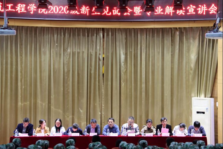 金秋十月,碧空如洗,凉爽舒适。2020年10月15日下午建筑工程学院在浴星湖大讲堂举行2020级新生见面会暨专业解读宣讲会,参加此次宣讲会的领导及老师有建筑工程学院院长杨志刚、党支部书记黎晓明、副院长余春泉、办公室主任赵学敏、教务科副科长许冬冬、学工科副科长许永飞、园林工程教研室主任赵美娜、工程造价教研室主任胡燕芳、建筑工程技术与建筑装饰教研室主任王欢、土木工程教研室主任邓映香、水利水电教研室主任林蔚以及建筑工程学院2020级全体新生。本次大会由学工科副科长许永飞主持。