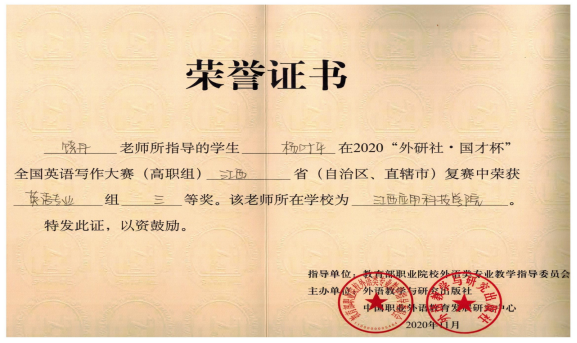 11月8日“外研社•国才杯”全国高职高专英语写作大赛江西省复赛,必赢官网3位参赛同学全部获奖,公共英语组2个三等奖(王杰(涂湘莹老师指导)、段媛媛(万菲老师指导)),专业组1个三等奖(杨叶平(饶丹老师指导)。