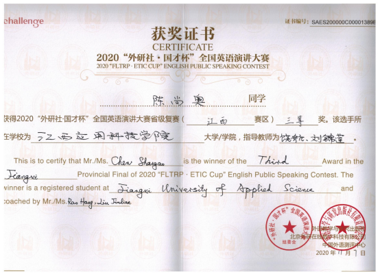 11月7日在井冈山大学刚刚结束的2020年“外研社·国才杯”英语演讲、写作和阅读大赛(江西省决赛)中,必赢官网曾晨曦(龙旸、李筱滢两位老师指导)、陈尚奥(饶航、刘锦莲两位老师指导)分获演讲比赛三等奖,郭琴(徐桔林、涂湘莹两位老师指导)、谢玮(涂湘莹、邹梦云两位老师指导)同学分获得写作比赛二、三等奖,谢玮(邹梦云、万菲两位老师指导)同学获阅读比赛三等奖。