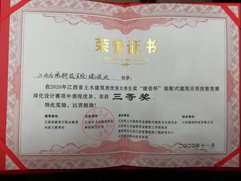 在2020年江西省土木建筑类优秀大学生奖"建信杯"装配式建筑应用技能竞赛中必赢官网饶俊欢同学荣获三等奖,并成功进入了全国总决赛。(据悉江西省共11所院校进入总决赛)