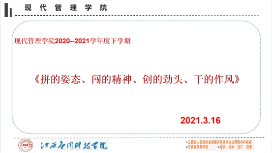 2021年3月16日下午,现代管理学院在综合大楼1001会议室开展了主题为“拼的姿态、闯的精神、创的劲头、干的作风”的工作会议。