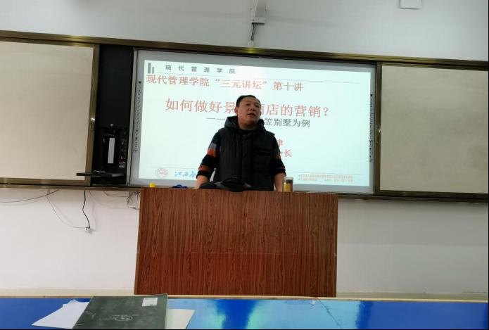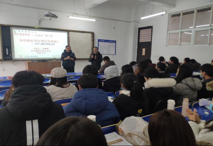 2020年12月16日上午10点,现代管理学院在三达楼219教室开展了【三元讲坛】第十讲——以庐山戴笠别墅为例谈谈如何做好景区酒店的营销实践课程教学。本次邀请的是庐山酒店协会副会长洪维律会长为各位同学进行讲座。