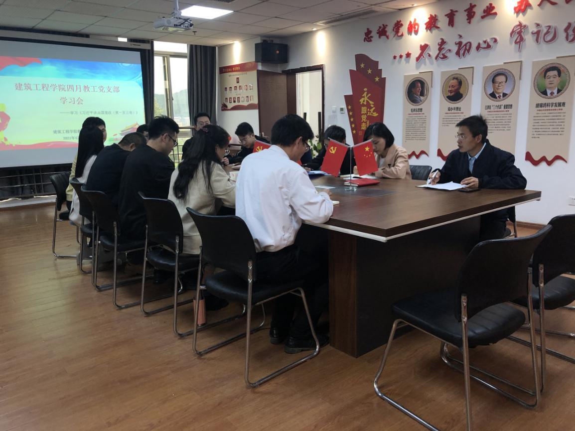 根据学院党总支和支部委员会就学习党史教育的工作安排,2021年4月26日下午2:30分,建筑工程学院教工党支部组织全体教工党员在综合大楼302党员活动室开展学习《习近平谈治国理政》(第一至三卷)专题主题党日活动,教工党支部全体党员教师参加学习,会议由建筑工程学院教工党支部书记许冬冬主持。