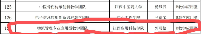 根据《关于印发<江西省高水平本科教学团队建设方案>的通知》(赣教高字〔2020〕34号)文件精神,在学校教务处精心组织下,我院物流管理专业教师积极申报“物流管理专业应用型教学团队”。经省教育厅组织专家评审,我院“物流管理专业应用型教学团队”获评2020年江西省高水平本科教学团队立项,此次立项的183个教学团队,仅有5所民办高校教学团队立项。我院获评数量位居全校前列。在今后的本科教学工作中,我院物流管理专业优秀教学团队将继续在教学内容、教学方法、教学改革等方面充分发挥带头和示范作用,促进教学质量持续提升。学院将以此为契机,激励全院各教学团队继续努力,不断提升团队建设水平,深化教育教学改革、探索创新应用型人才培养模式。