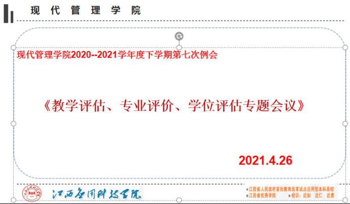 2021年4月26日下午,现代管理学院在综合大楼1001党员活动室开展本科“教学评估、专业评价、学位评估”专题会议,分院全体教职工参加了此次会议,会议由分院院长谢远健主持。