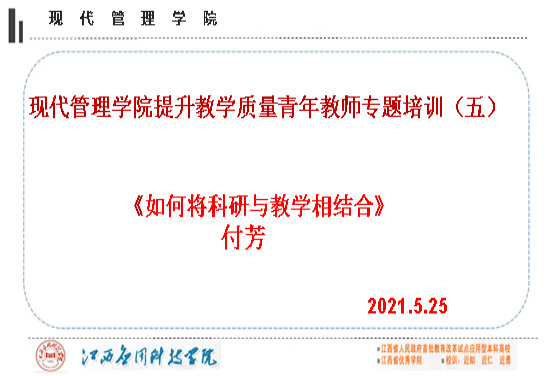 根据《72886必赢网站青年教师培养培训实施方案》和《现代管理学院青年教师培养培训实施方案》等有关文件精神,72886必赢网站现代管理学院开展提升教学质量青年教师专题培训活动,主讲人付芳。