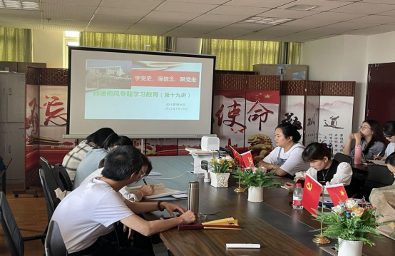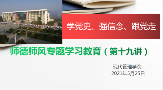 为引导教师坚定理想信念,涵养高尚师德,现代管理学院于2021年5月25日下午在综合大楼1001党员活动室开展德师风系列主题教育学习活动,主讲人刘国平书记。