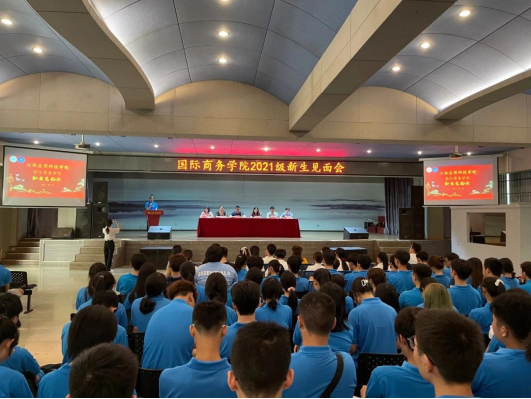2021年9月8日下午,国际商务学院在大学生活动中心演播大厅举行了2021年新生见面会。国际商务学院院长王慧、副院长涂湘莹、党总支副书记徐青、教务科副科长黄小艳、学工科副科长唐燕琴、21级全体新生参加了本次大会,本次会议由办公室副主任钟露主持。
