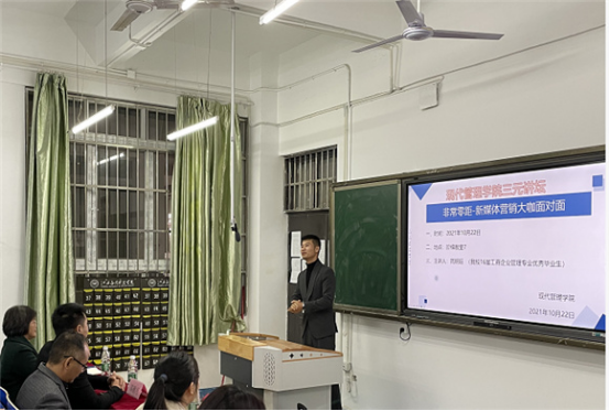2021年10月27日下午,由现代管理学院主办的“非常零距离”访谈系列活动在三达楼阶梯七教室开展。此次活动有幸请到了16届工商企业管理专业优秀毕业生周明旺。周明旺现为江西橙光文化传媒公司负责人,主营短视频营销,个人IP成了江西上饶市广丰区本土短视频营销的头部“网红”。