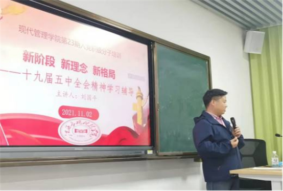 2021年11月2日晚7点,现代管理学院分党校第23期入党积极分子第四堂党课开讲,由现代管理学院党总支书记刘国平主讲,授课内容为学习十九届五中全会精神。