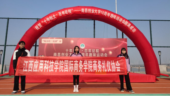 12月11日上午,在朝阳江滩公园国际商务学院国际商务礼仪社团的部分会员在社团指导老师谢海红老师带领下参与了南昌创业大学十周年趣味运动会,南昌创业大学是由市工信委主办,2010年底经南昌市人民政府批准成立,致力于为全市中小微企业提供培训、创业指导、咨询服务的公益性机构,学员主要为全市中小微企业中高层管理人员。组织参加本次趣味运动会的主要目的是促进礼仪社团与企事业单位的联系,使社团成员拥有更多机会参与实践。