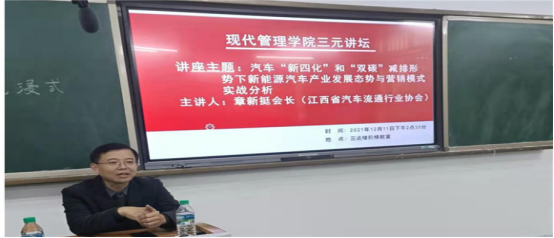2021年12月11日下午2:30,我院在三达楼阶梯7教室开展了三元讲坛系列主题讲座,本次主题讲座有幸邀请到了江西省汽车流通行业协会常务会长章新挺,此次讲座主题为汽车“新四化”和“双碳”减排形势下新能源汽车产业发展态势与营销模式实战分析,授课对象是现代管理学院市场营销专业全体学生和部分汽车专业学生。本次大会由现代管理学院黄小丽老师主持。