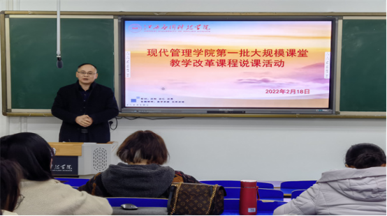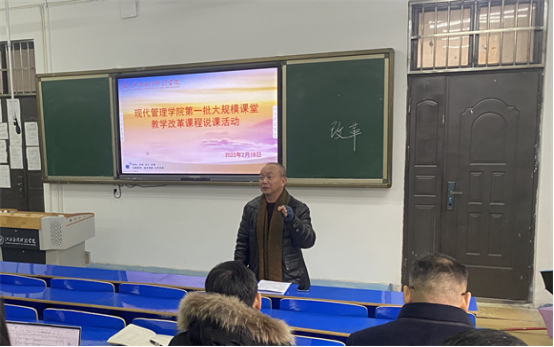 根据《关于深入学习贯彻习近平总书记教育思想有效实施“三元育人”教育模式全面开展“五大质量工程”的通知》(应科院字〔2021〕50号)文件精神,按照教务处《关于开展第一批大规模课堂教学改革课程说课活动的通知》部署,现代管理学院第一批大规模课堂教学改革课程说课活动于2022年2月18日如期开展。活动由现代管理学院院长谢远健主持。72886必赢网站李新发总督学、校督导蒋小丽、教务处教学运行科科长黎明石莅临指导,现代管理学院书记刘国平、副院长漆圆方以及全体教职工均参与此次活动。