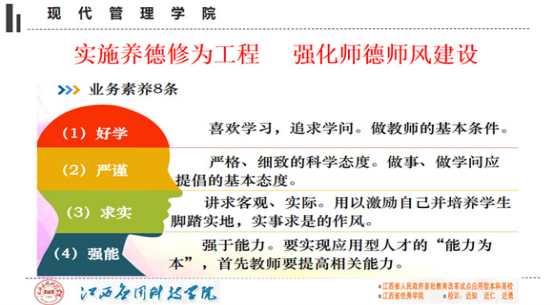 为扎实推进我院教师养德修为工程建设,引导教师把教书育人与自我修养结合起来,做到以德立身、以德立学、以德施教。现代管理学院于2月23日下午,在综合楼1001室召开了“教师养德修为工程学习会-业务素养8条”,会议由院长谢远健主持,我院全体教师参加了此次会议。