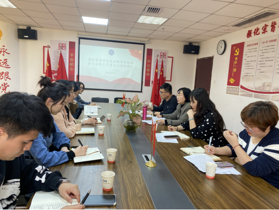 3月11日下午,国际商务学院在综合大楼404办公室召开国际商务学院本科教学工作合格评估部署大会暨三月重点工作协调会。副校长胥懋云、国际商务学院院长王慧、党总支副书记徐青、副院长罗小丽出席会议,国际商务学院全体行政班子成员参加此次会议,会议由徐青主持。