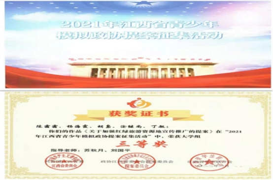 由共青团江西省委、政协江西省委员会提案委员会、江西省学生联合会共同开展的2021年江西省青少年模拟政协提案征集活动中,我院提交的《关于加强红绿旅游资源地宣传推广的提案》中荣获大学生组“三等奖”。