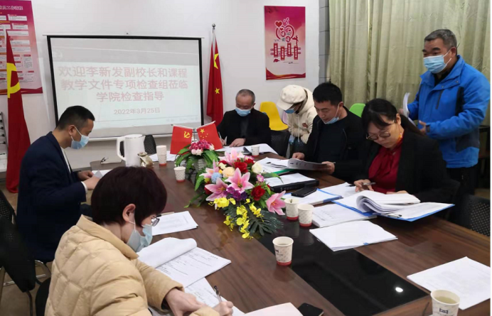 为进一步加强学校教学基础建设和规范管理,促进教师教学水平和能力的提升,2022年3月25日下午15:00由学校李新发副校长带队,评建办主任刘海梅、质量监控中心主任樊立君、教务处副处长蒋德勇、罗玉莲、督导员王修杰教授一行六人到教育学院开展了课程教学大纲和教案专项检查工作。