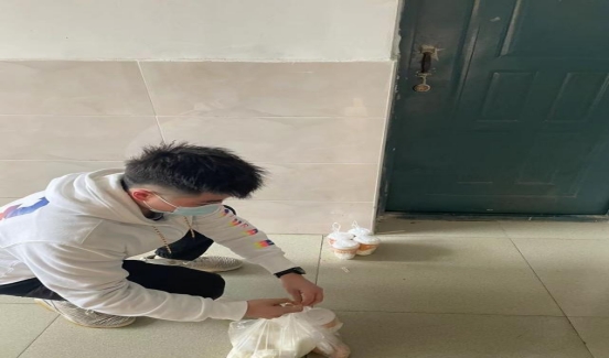 因新建区吾悦广场发现新冠肺炎感染者,因此3月10日以来有前往过吾悦广场的同学将采取就地隔离的方式。为解决隔离人员的就餐问题,我作为志愿者,佩戴好口罩领取到早餐后,进行无接触式配送,解决隔离人员的就餐问题,以及日常物资的购买及配送。